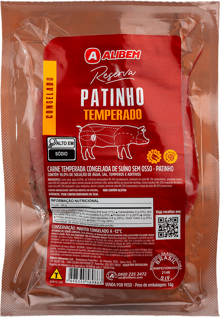 O Patinho Suíno Temperado da Alibem é um corte selecionado da carne suína, conhecido por sua maciez e suculência. Ele já vem pré-temperado, o que facilita muito o preparo, seja no forno, na grelha ou na frigideira. O tempero é equilibrado, realçando o sabor natural da carne sem sobrepor, permitindo um resultado saboroso e prático para refeições rápidas ou especiais.