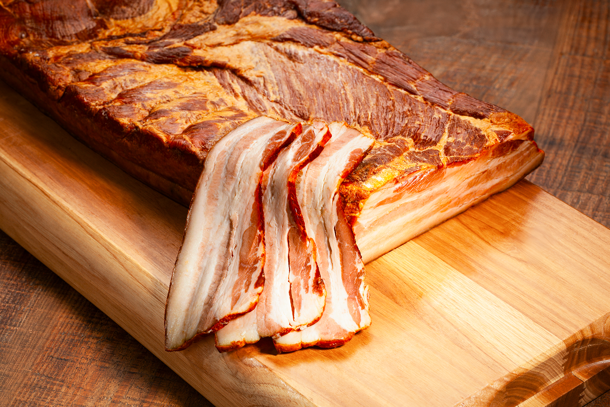 Produzido a partir da barriga suína, o Bacon equilibra carne magra e gordura. Através da cura e defumação controlada, adquire aroma marcante, textura firme e sabor característico, sendo um ingrediente versátil para diversas receitas.